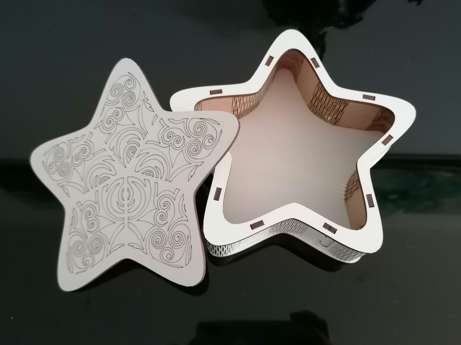 Caixa em MDF branco com gravação na tampa. A tampa pode ser personalizada a gosto.